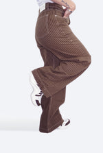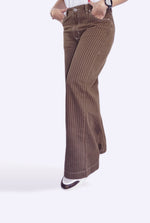 Jean de mujer silueta palazzo cafe con rayas, con pierna y bota ancha y tiro alto.