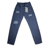 Jean de mujer silueta momfit, con rotos en frente, 5 bolsillos y tiro alto.
